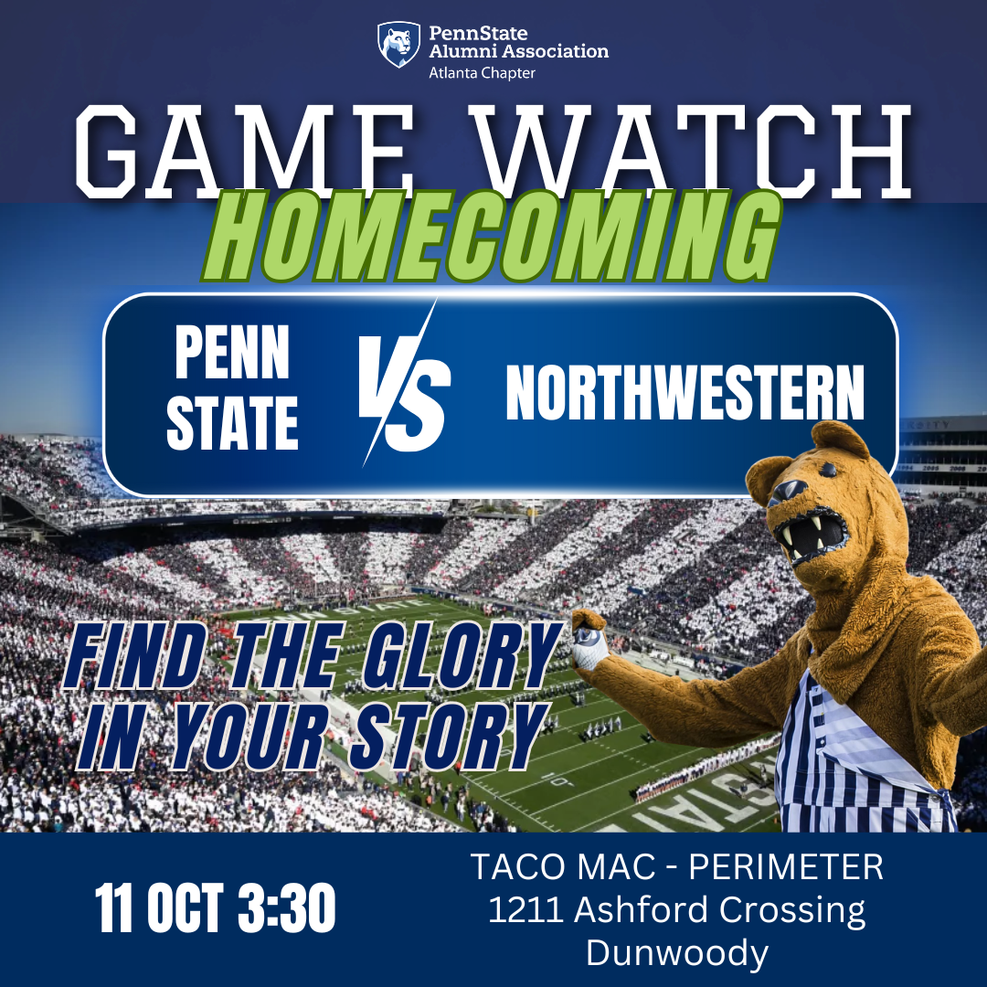Game Watch RSVP - Penn State vs. Northwestern. Due to Fall Break (local school districts) we will not have our usual GameDay activities.
